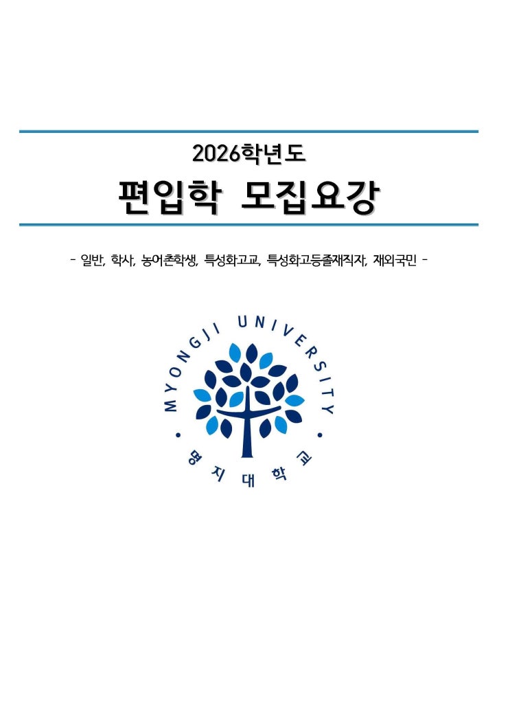 2026 학년도 명지대학교 편입모집전형 <img src="https://blogthumb.pstatic.net/MjAyNjAyMjRfMjE3/MDAxNzcxODkyNzc4MTIx.MlJJrSnrlrjRxFWuxtUMPx0EMYTVpyGybpzbLU1yHXIg.uOXOBvCrh4vZna7o2Xq6ItXNx_T9y7MDQjoeJBcLoFUg.JPEG/2026_%C7%D0%B3%E2%B5%B5_%B8%ED%C1%F6%B4%EB%C7%D0%B1%B3_%C6%ED%C0%D4%B8%F0%C1%FD%C0%FC%C7%FC_%C6%E4%C0%CC%C1%F6_01.jpg?type=s3" />
