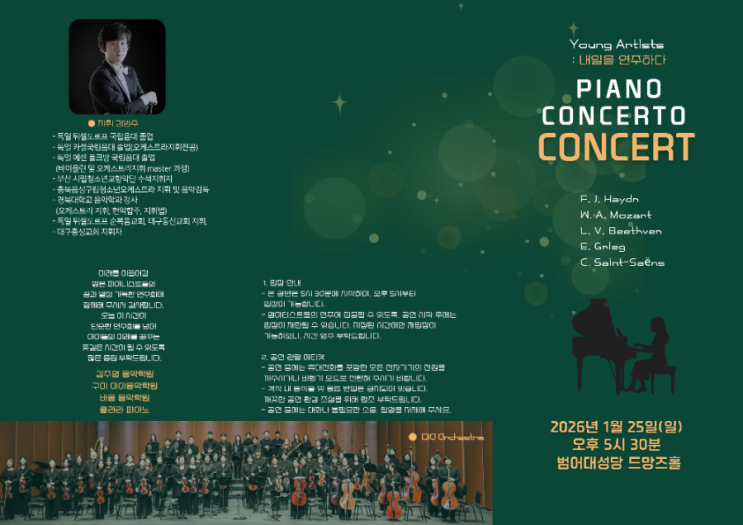 저희 영아티스트 친구들이 1월25일 드망즈홀에서 디오오케스트라와 피아노 협연이 있습니다 많은 관심 부탁드리겠습니다 김주영 음악학원에 최근 좋은 소식들이 있었습니다~ 신월초 박민정 예술의전당 영재 아카데미에 합격 이재헌.임채비 경북예고 합격 영재반은 영아티스트 콘서트 뿐 아니라 개인 독주회와 오케스트라 협연 및 유명 교수님과의 마스터클래스 기회를 제공합니다 작년에는 대구.경북에서 열리는 음협콩쿨.예고콩쿨.대학콩쿨 등에서 최상위권에 입상하는 성과를 내고 수도권에서 열리는 난파콩쿨.예원콩쿨.음악세계 전국결선등에도 참가해 가능성도 보게 되었습니다~ 김주영음악학원에서 영재반 신입 친구를 모....... <img src="https://blogthumb.pstatic.net/MjAyNjAxMDhfMTQx/MDAxNzY3ODQxMzA3ODI5.1GP7LoWh3e0eNqI2B7PbMFjgfTLuw5l2v1sthkQurqMg.NsoqJ4ozPNmbVpOJoxyus_RCRFNXqqsFKwaS-jmu7jUg.PNG/900%A3%DF1767839397616.png?type=s3" />