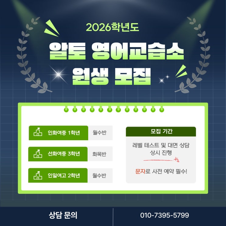 2026년도 알토 영어교습소의 원생 모집 안내 드립니다. 공고에 없는 다른 학년과 중1 화목반은 현재는 정원 마감되었습니다. 중1반은 기존 학생들이 대부분 인화여중에 배정을 받아서 인화여중 반으로만 이루어집니다. 2학기부터 시작되는 내신 수업을 위해서이기도 하고, 작은 교습소이다 보니 교과서가 다른 학교들을 많이 수용할 수 없는 점 양해 부탁 드립니다. 다른 학년보다도 중1의 경우는 탄탄한 기초 다지기와 문법 개념의 확립을 원하시면 하루라도 빨리 등록 하시기를 말씀 드려봅니다. 궁금하신 사항과 학년별 자세한 내용은 대면 상담을 통해 말씀 드릴게요 :) <img src="https://blogthumb.pstatic.net/MjAyNjAzMDZfMjY0/MDAxNzcyNzg2OTE5NTcx.v9G-nRQhf_Smi_zXvV8fS_zaNZLhsBaVcwu8gorvFpsg.FLTH4PItFq7gxwlqBSsE64yM0AcKHAQ8XryRc02To80g.JPEG/%C1%A6%B8%F1%C0%BB_%C0%D4%B7%C2%C7%D8%C1%D6%BC%BC%BF%E4..jpg?type=s3" />