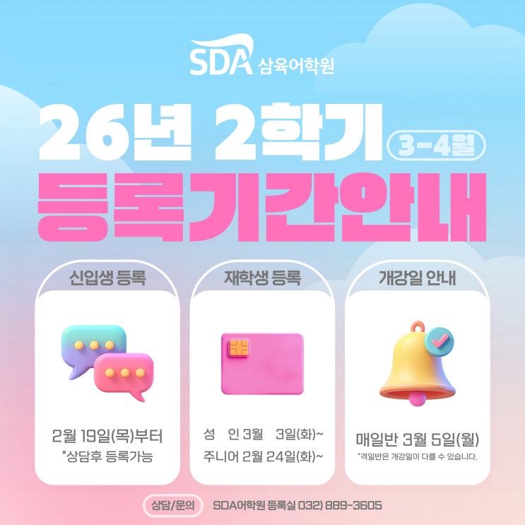 아이들도 어른들도 설레는 새학기가 시작되었습니다. 벌써 부터 들뜬 아이들의 모습이 눈에 선한데요~ 2학기(3,4월 학기) 등록 안내 드립니다. 이번학기에도 금요클럽은 계속됩니다. 학원이 단지 공부만 하는 곳이 아니라 즐겁게 이야기하고 노는 공간이 될 수 있는 금요일이지요~! 관심 있으신 분들은 아래를 참고해주세요. 더 자세한 내용을 알고 싶으시다면 언제든지 상담전화 가능합니다. 전화 상담 혹은 방문 상담을 위해서 전화 주세요. SDA삼육어학원 인하대역점 연락처: 032-889-3605 주소: 인천 미추홀구 용정공원로 33 <img src="https://blogthumb.pstatic.net/MjAyNjAzMDlfMTEy/MDAxNzczMDI5NzMzNjQz.hdmQL_yp-JHeJ6b5eyPUAGmnmTWX4aes-NoYClu9TNIg.JlI_hhmUF1-bpiskMuE4v5vz4tKuMd8_pqZqAEzCY-0g.JPEG/KakaoTalk_20260224_175328105_01.jpg?type=s3" />