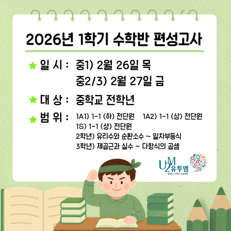 [유투엠수학-부평부개점] 2026년 중학교 1학기 수학반 편성고사