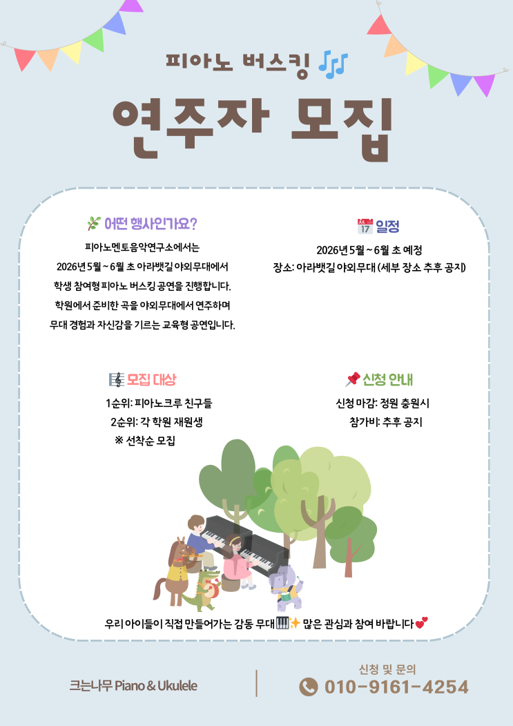 2026 아라뱃길 피아노 버스킹 연주자 모집 안녕하세요 :) 피아노멘토음악연구소 소속 크는나무 피아노 입니다. 2026년 5월 ~ 6월 초, 아라뱃길 야외무대에서 특별한 피아노 버스킹 공연을 준비하고 있습니다 아이들이 무대 위에서 직접 연주하며 음악으로 소통하고 성장하는 시간을 만들고자 합니다. 아라뱃길 피아노 버스킹이란? 실내 연주회가 아닌, 야외 공간에서 자유롭게 진행되는 피아노 공연입니다. ✔ 무대 경험을 쌓는 교육형 공연 ✔ 관객과 소통하는 열린 버스킹 ✔ 자신감과 표현력을 기르는 성장 무대 콩쿠르 형식이 아닌 “경험 중심”의 즐거운 공연입니다 공연 일정 2026년 5월 ~ 6월 초 예정 아라뱃길....... <img src="https://blogthumb.pstatic.net/MjAyNjAyMjVfNTkg/MDAxNzcyMDA0NjY4MTM0.gl4T0kgyS1B5d__JMVdKGteWgWKdcbOXoHbDKrWPx_Ug.EGkMce2OSnAlMj1TPFrGw-ADTWioM39QARjiGbFLAeIg.PNG/%BE%C6%B6%F3%B9%EE%B1%E6%B9%F6%BD%BA%C5%B7%B8%F0%C1%FD%BE%C8%B3%BB.png?type=s3" />