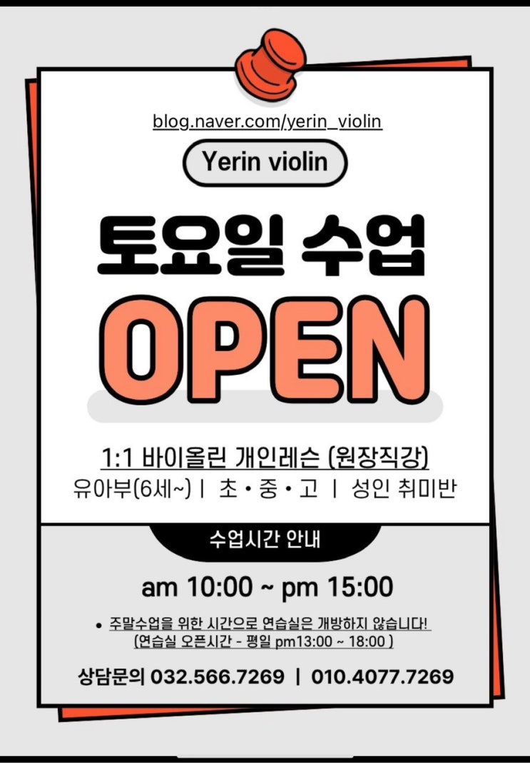 안녕하세요! 예린바이올린 원장 안예린입니다 토요수업을 원하시는분들이 항상 계셔 여러번 토요일반을 오픈했음에도 원활하게 진행되지 않는탓에 이제 토요수업은 열지않으리.. 다짐했는데 최근 한달동안 지속적으로 많은 문의가 들어와 다시 오픈하게 되었습니다! 지난주까지도 토요수업 문의 주신 분들께 수업없다고 말씀드렸는데(ㅠㅠ) 이렇게 빨리 오픈하게 될줄 몰랐어요.. ㅎㅎ 상담문의 주셨던 분들께는 제가 빨리 연락드리도록 하겠습니다! 체력 잘 챙겨서 토요수업도 열정 가득 준비할게요! ( 현재 , 10~11시 타임 마감 1:30분 타임 마감입니다! ) 수업문의는 032.566.7269 또는 010.4077.7269로 나이 / 악기 경험 유무/ 원하시는 레슨....... <img src="https://blogthumb.pstatic.net/MjAyNjAyMjBfODMg/MDAxNzcxNTgxNjUyODA3.nZxotSBsl-G4-a5he05P1ITNVqcs93RGgU8TJEb9XrEg.h1-lANgIwmS0bbTJEnAhS7B_BCXac0UTBXlnroC8yT4g.JPEG/output%A3%DF990675318.jpg?type=s3" />