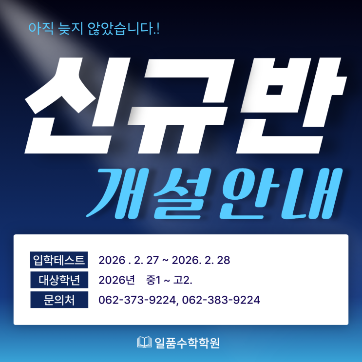 방학기간내에 본원에서 학습하지 못한 친구들에 한하여 새로운 신규반을 개설합니다. 유선상담 가능하니 전화 문의 주셔도 됩니다. 조기 마감될 수 있습니다. 대한민국의 모든 수험생들을 응원하며!!!!!! ㅈ ㅣ금까지 '수학시험공부' 잘 가르치는 광주전남에 위치한 일품수학학원이였습니다. 감사합니다. 문의 화정본원 : 062-383-9224 화정고등관 : 062-373-9224 빛가람본원 : 061-333-8001 #화정동수학학원 #광주수학학원 #광주서구수학학원 #풍암동수학학원 #금호동수학학원 #나주수학학원 #나주혁신도시수학학원 #나주빛가람동수학학원 <img src="https://blogthumb.pstatic.net/MjAyNjAyMjNfNTAg/MDAxNzcxODMwNjg3MDE2.OUE3veF9a1SQHryW1ZN2_Goxm8p8iN4GlhxccQ1BR1gg.Cw_sOXTwHsRJjAKx7huMPN3bPegewWLjC2Tj2hd59Esg.PNG/%C1%A6%B8%F1%C0%BB_%C0%D4%B7%C2%C7%D8%C1%D6%BC%BC%BF%E4..png?type=s3" />