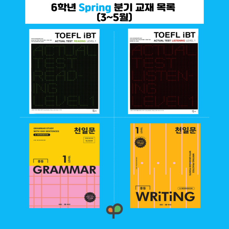 안녕하세요 PIE어학원입니다. 학원에서 사용하는 6학년 자체 교재(Workbook)와 시중 교재 안내드립니다. ▶ TOEFL ◀ ■ TOEFL RC Workbook (3개월 진도) ■ TOEFL LC Workbook (3개월 진도) ■ 토마토 토플 ibt actual test 1 (Reading) (6개월 진도) ■ 토마토 토플 ibt actual test 1 (Listening) (6개월 진도) PIE어학원에서 자체 개발한 Workbook과 시중에 나와있는 토마토 토플 ibt actual test 2을 모두 사용합니다. TOEFL RC 다양한 주제의 글을 읽으며 핵심 내용을 파악하는 능력을 길러줍니다. 어휘력과 문장 구조를 익혀 영어로 된 글을 정확하게 분석할 수 있도록 돕는 수업입니다. TOEFL LC 영어 원어민의 발음을 통해 다....... <img src="https://blogthumb.pstatic.net/MjAyNjAzMThfMTg3/MDAxNzczODE3MDkyNzAy.4Llcmz7n9CgT0ud0QMdzNk_XCrQiN00Hblle9J-zy5og.lZnpBTYjKqGUl2xjaQsIq4YlMnqaeIK6kg8SigVnuF0g.PNG/2026_1%BA%D0%B1%E2_%B1%B3%C0%E7_%B8%F1%B7%CF%286%C7%D0%B3%E2.%BA%ED%B7%CE%B1%D7%BF%EB%29.png?type=s3" />
