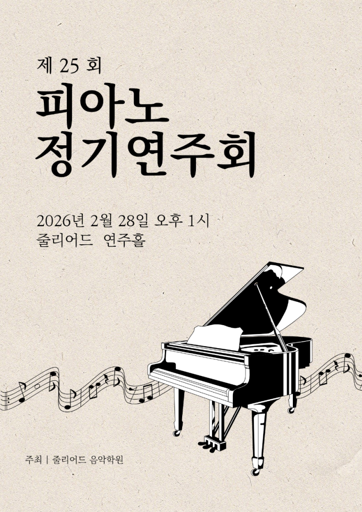 아이들이 오랜 시간 정성껏 준비한 정기연주회를 개최합니다. 한 곡 한 곡에 담긴 노력과 성장을 따뜻한 마음으로 함께해 주세요. 2026년 2월 28일 오후 1시 줄리어드 연주홀 . #안양피아노학원#석수동피아노학원 #석수3동피아노학원#충훈부피아노학원 #충훈동피아노#제25회정기연주회 #아이들의성장과노력 <img src="https://blogthumb.pstatic.net/MjAyNjAyMjRfNCAg/MDAxNzcxOTMzMDkyMjE2.55XHOeZXlI34wTuh_rZMjHUXhp50-QEZoAJC1Lx3rT8g.UoWI22w0DbzqpahgGPPaIFgqzK1zGCDuySoWagFMofMg.PNG/900%A3%DF1771829590246.png?type=s3" />