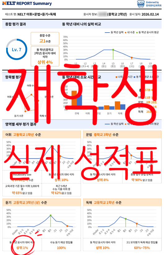Adventure 반부터 시작되는 성취 TEST + NELT 추적 관리 시스템 영어 실력은 “느낌”이 아니라 데이터로 확인해야 합니다. 비긴잉글리쉬어학원은 Adventure 반부터 정기적인 성취 진단과 외부 공인시험을 병행하여 아이들의 실력을 객관적으로 추적 관리합니다. ① 성취 TEST (내부 진단 시스템) 우리 학원의 수업 흐름에 맞춘 정밀 내부 진단 평가입니다. ✔ 단어·독해·문장 이해도 점검 ✔ 오답 유형 분석 ✔ 성적 리포트 제공 ✔ 오답노트 기반 보완 수업 진행 성취 TEST는 단순 점수 확인이 아닙니다. 아이의 학습 태도와 꾸준함을 함께 점검합니다. 점수가 아닌, “어디서 흔들리는지”를 정확히 찾아냅니다. ② NELT (외부 공인 영어 시험....... <img src="https://blogthumb.pstatic.net/MjAyNjAyMjNfMTQw/MDAxNzcxODQ0OTcxMTkz.v8z34V0CpPI_qJ-0hnl3Ws2FGFAm6RHRojTWoR7fZA0g.CbMi1CXoh5WXLqAyhdPGSitJ5Y0xHnwzvoAGGfKQYRAg.PNG/nelt.PNG?type=s3" />