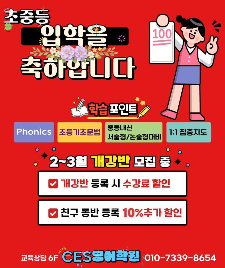 ▶ 예비 초/예비 중 2~3월 신입생 모집 겨울 방학도 며칠 안 남았어요 ▶학부모님들이 생각하는 방학 우리 아이가 잘 놀고 잘 먹고 잘 배웠으면 하고 희망과 기대감을 갖습니다. 아니 마음속~에는 은근히 방학이 언제 끝나지 육아에 지친 맘들의 마음속에 스멀 스멀 드는 생각이 ㅎㅎㅎㅎ 그래요 이제 설 연휴도 지나고 따뜻한 봄이라는 계절이 다가옵니다. 순이 돋고 새싹이 올라오는 희망의 찬 계절 3월 추운 겨울에도 잘 견딘 고구마에서 자란 꽃 잎처럼 우리 아이도 사랑과 정성을 듬뿍 주면 이렇게 예쁘게 성장하지 않을 가요! ▶놀기도 했지만 공부도 열심히(ex, 수업 일부) 1월에 등록해서 영어를 처음 접해보는 초등1학년 친구는 파닉스....... <img src="https://blogthumb.pstatic.net/MjAyNjAyMjNfMjIy/MDAxNzcxODMzMjQwMjgy.Ra6EkscwqFai9snDQUC4Rr7lLJ7wpcEf-85NzcHvZHkg.5EPCEprYg21rfT4lv-nOXDvSfBKL1RIP6UskA14o9xkg.JPEG/%BD%C5%C7%D0%B1%E2%B8%F0%C1%FD_%BF%EE%C1%A4.jpg?type=s3" />