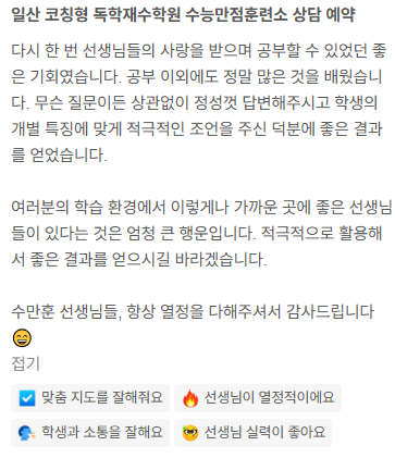 안녕하세요! 대치동 교육 소식을 가장 생생하게 전달하는 레팡 기자입니다! 드디어 예설라 대치원이 문을 연 지도 한 달이 되었습니다. "우리 아이 문해력, 정말 좋아질까요?"라며 걱정 반 기대 반으로 시작하셨던 학부모님들의 모습이 기억나는데요. 지난 한 달간 아이들이 보여준 드라마틱한 변화를 레팡이가 직접 취재해 왔습니다. 단순한 공부를 넘어 '성장'을 경험한 아이들의 이야기를 지금 바로 공개합니다! [글씨는 마음의 거울, '성취감'을 쓰는 아이들] 많은 부모님이 걱정하시는 아이들의 필체, 예설라는 단순히 '바르게 써라'라고 명령하지 않습니다. 글씨는 곧 아이의 집중력과 마....... <img src="https://blogthumb.pstatic.net/MjAyNjAyMjNfMzkg/MDAxNzcxODIxNTc2MDA2.wiObqF0N5FyHBeLGuBUNqApoJBcY1Rp9sSP2UVnpajUg.D6wP_Blz-qHo9H3PtHrGUDpWfvM3dLeGj6X38Ehj18Ug.PNG/%B1%D7%B8%B21.png?type=s3" />