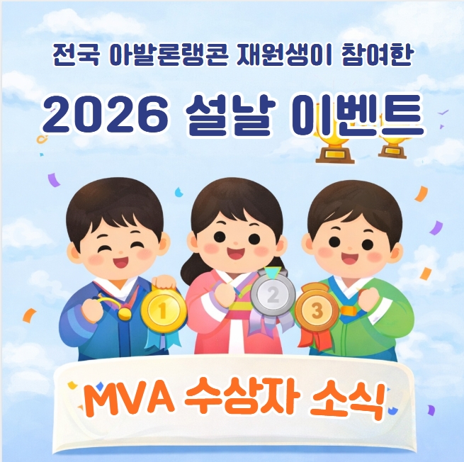 설 연휴 동안 진행된 MVA Event 가 성공적으로 마무리되었습니다. 전국 학생들이 함께 참여한 이번 이벤트는 1:1 매치를 통해 영어 감각을 유지하고 즐겁게 실력을 점검할 수 있는 시간이었습니다. 수상자 리스트 구리캠퍼스 수상 결과 이번 설날 이벤트에서 구리캠퍼스에서는 총 6명의 학생이 수상자로 선정되어 상품을 받게 되었습니다. 연휴 기간임에도 꾸준히 참여하며 성실하게 매치를 진행한 학생들의 노력이 좋은 결과로 이어졌습니다. 참여 자체가 의미 있었던 이벤트 이번 이벤트는 단순한 순위 경쟁을 넘어, 연휴 동안 영어 학습 흐름을 끊지 않고 자연스럽게 이어갈 수 있었다는 점에서 더 큰 의미가 있었습니다. 특히....... <img src="https://blogthumb.pstatic.net/MjAyNjAyMjRfMjc0/MDAxNzcxOTM5MjUyMjUw.i0_t0yVmpNd5Mkw286GUgb6OHTxdwdmOKCFNI0ZffMAg.xtA33p5tqicmvFNK2PtBLLGcdvc_c_B5PF-Roel3Hb8g.JPEG/1771939238666.jpg?type=s3" />