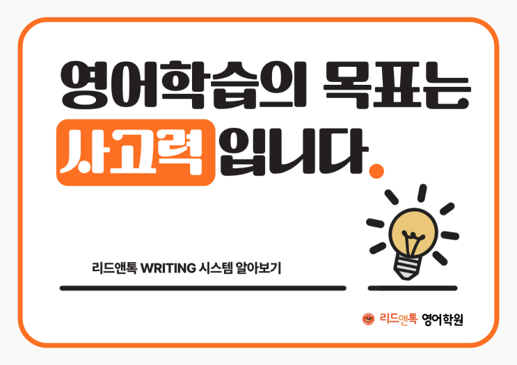 영어학습의 진짜 목표는 사고력입니다 영어를 배우면서 단순히 단어와 문법을 외우고, 반복하는 학습만 하고 있지는 않나요? 이제 영어학습의 목적은 그만큼 단순하지 않습니다. 사고력을 기르는 것이 진짜 목표입니다. 왜 사고력인가요? 영어를 배우면서 논리적 사고와 문제 해결 능력을 기를 수 있습니다. 단순히 언어를 암기하는 것이 아니라, 언어를 통해 이해하고 분석하는 힘을 기를 수 있다는 점이 중요한 포인트입니다. 영어로 생각하고 표현하는 과정에서 자연스럽게 사고력이 함께 향상됩니다. 리드앤톡 Writing 시스템으로 사고력 UP! 리드앤톡 Writing 시스템은 단순한 글쓰기 훈련을 넘어서, 아이들이 창의적이고 논리적인 사고를 통....... <img src="https://blogthumb.pstatic.net/MjAyNjAyMjFfMjgy/MDAxNzcxNjYxNzA0NzEz.B15jSqq5cdvGGSZ2OF-N_SZXYALPxVRCwbDolWKa0_Ug.qfgs3gpCDL79qTRxa2PhMJ-Q3qttFA8zcyvvnBGXmogg.PNG/1.png?type=s3" />