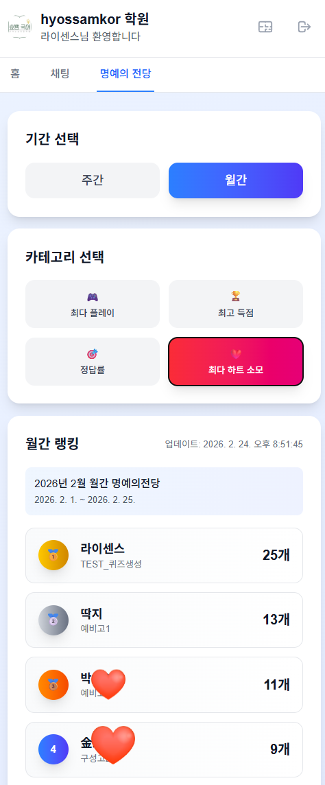 아자아잣!!! 아직 역전의 기회는 남아있다고!!! 화이팅!!!! 열심히 노력한 자 누려라!! 반기별(1월~6월) 1. 26년 전반기 MVP 1인 - 아이패드 1대(기본형 모델) 제세공과금 개인 부담 2. 각 학급 최우수 학생 - 상품권 3만 3. 최우수 클래스 전원 - 음료 쿠폰 1매씩 매월 2월 최우수 학생 1인 - 상품권 3만 각 학급 최우수 학생 - 상품권 1만 최우수 클래스 전원 - 음료 쿠폰 1매씩 화이팅!!! <img src="https://blogthumb.pstatic.net/MjAyNjAyMjRfNyAg/MDAxNzcxOTM1NTQ1ODQx.cjngpcU0IyuebALxjCqYVYswJS4bvNG-18YFbfUENLwg.4zP5DyyUFdAkA_zpoaSKJwrzbGZ2MONqZjaTqrMGQkcg.PNG/%BD%BA%C5%A9%B8%B0%BC%A6_2026-02-24_205152.png?type=s3" />