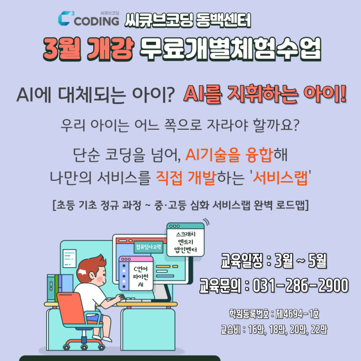 용인 기흥 동백역 앞 석성초 근처 코딩학원 씨큐브코딩 동백센터 - 봄학기 신입생 모집 무료개별체험수업 OPEN!