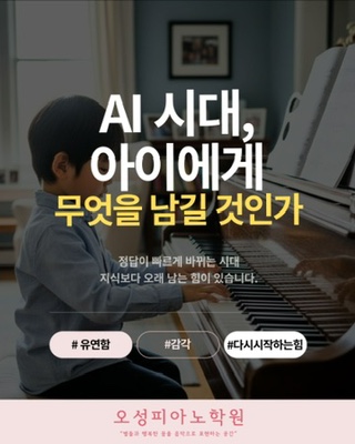 안녕하세요 :) 오성피아노입니다 AI 기술이 일상의 속도를 바꾸고 있는 요즘, 아이들이 궁금한 것이 생기면 바로 AI에게 묻고 빠르게 정담을 얻을 수 있는 시대에 살고 있습니다. 그래서 많은 학부모님들께서 이러한 시대에 아이에게 어떤 교육이 정말 필요할까? 하는 고민이 있습니다. 이러한 시대에 더 가치있는 것은 ‘감정표현’, ‘생각하고 느낄 줄 아는’ 음악교육이라고 생각합니다. 정답을 외우는 아이보다 생각하고 느끼며 표현할 줄 아는 아이로! 피아노 교육을 통해 아이들은 자연스럽게 ✔️스스로 생각하고 ✔️ 느끼고 ✔️ 표현하는 힘을 기르게 됩니다 :) 이 과정은 AI가 대신해 줄 수 없는 아이만의 사고력과 감성을 키워....... <img src="https://blogthumb.pstatic.net/MjAyNjAxMjRfMTEg/MDAxNzY5MjQxNzQxMTAx.P9MJgWw_lZzqpv_WaVXQ-g0_YvWBY3-ij4UUhQ3RigIg.8RehZ8IWQP6iYuwQ8pe4I9kZuhhrDC-rj-PGT0NvSN8g.JPEG/IMG%A3%DF3794.JPG?type=s3" />