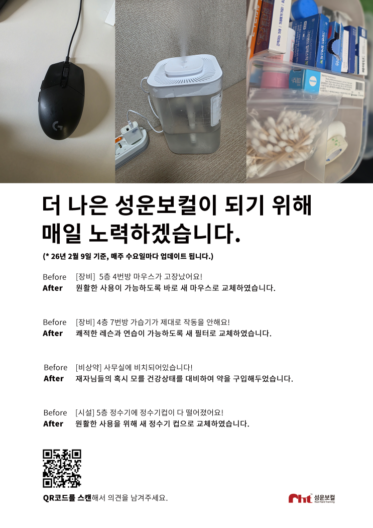 안녕하세요~! 성운보컬의 시설매니저 입니다!! #2026년 #2월 9일주에도 찾아온 #시설개선노트 입니다! 시설개선노트란? 성운보컬의 시설들(레슨실,연습실,화장실 등등..)을 이용하면서 고쳐줬으면 하는, 개선되었으면 하는 부분들을 적을 수 있는 소통창구 입니다! 시설개선노트의 장점! 첫 번째로, 언제,어디에서나 #QR코드 를 통해 손쉽게 #비대면 으로 시설에 대한 의견을 제출할수 있습니다! 두 번째, 제출된 의견은 바로 접수되어, 최대 1일 이내에 해결됩니다! 세 번째, 매주 갱신되는 개선노트를 통해 이번주 성운보컬에는 어떤 점들이 보수&개선 되었는지 한 눈에 볼 수있습니다! 와우,,, 너무 본격적인데? 아직 놀라긴 이릅니다!! 시....... <img src="https://blogthumb.pstatic.net/MjAyNjAyMTJfMjcz/MDAxNzcwODgxODUzOTA0.Gx89VPXfotKXlRi33TqCanZ2yVJa7Hwymj5rGrtnV4Yg.cw7yuj5yk5Li2nl8Z9-WKyNQFQeDSZ2lBM6CJx7LUxcg.PNG/%B0%B3%BC%B1%B3%EB%C6%AE_260209.png?type=s3" />