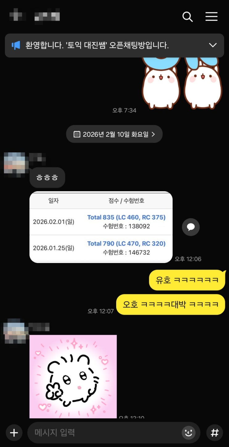 안녕하세용 오늘은 짧게 하고 넘어갈게용 ㅎㅎ 이번에 2월 1일 토익 결과가 나왔는데 학생 중에... 단 두 번만에... 토익을 끝낸 학생이 있어서 포스팅 합니당 ㅎ 800만 넘으면 된다고 했는데... 첫 토익을 700점대를 찍더만.. 바로 일주일 후에... 800점대.. 매번 느끼는 거지만... 계속 하면 오르긴 합니다.... 쉬지 않고... 근데 그 시점을 언제로 당기냐가 문제인듯 합니다. 하다가 쉬고 포기하고.. 다시 처음부터 하고 포기하고.. 이러지만 않고... 계속 꾸준히 하다보면.. 웃는 날이 오실겁니당 못 오는 날 온라인으로도 수강이 가능한 학원이다보니.. 복학 하고 못 오는 날에는 영상으로 보는 학생분들도 많이 계시긴 합니다. 실시간으로....... <img src="https://blogthumb.pstatic.net/MjAyNjAyMTFfNTIg/MDAxNzcwNzY5ODU3MzEx.zOMLSaaemRO7W1BOlXiYPQYhdVc-HA-KG6-eZAwsQ9og.tbvCV9Wp6utrAIkWx9cG8GUd025fbu0KNAlcZNtBfpsg.JPEG/KakaoTalk_20260211_092305274.jpg?type=s3" />