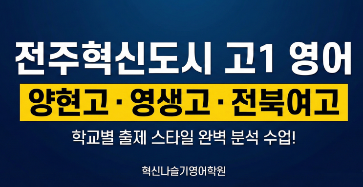 안녕하세요. 전주혁신도시 혁신나슬기영어학원입니다. 요즘 고1 어머님들 상담이 많은데, 그 중에 양현고 외에 타 학교 상담문의가 많습니다. 현재 고1 수업은 양현고뿐 아니라 영생고, 전북여고 학생들도 함께 수업하고 있습니다. 학교별 교과서와 시험 범위에 맞춰 수업을 진행하고 있습니다. 양현고 서술형과 변형 문제가 반복적으로 출제되며, 어법과 지문 적용력을 함께 묻는 유형이 특징입니다. 시험 패턴을 분석해 구조 이해 중심으로 대비합니다. 영생고 빈칸·순서·삽입·어법 등 사고형 문제가 다양하며 서술형에서도 영작과 구조 재구성이 포함됩니다. 지문 흐름을 정확히 읽는 훈련이 중요합니다. 전북여고 교과서와 부교재가 균형 있....... <img src="https://blogthumb.pstatic.net/MjAyNjAyMTJfMSAg/MDAxNzcwODgxNDM4ODg0.T2PWT9KfcXVNqxGvTlZKse14FoI77MEBlghrs9SR58wg.BtGHcnXw-4XKk2bHia5ZC8li2jxP-IW6Jq-Qk-0sntkg.PNG/%C0%FC%C1%D6%C7%F5%BD%C5%B5%B5%BD%C3%B0%ED%B5%EE%BF%B5%BE%EE%C7%D0%BF%F8.png?type=s3" />