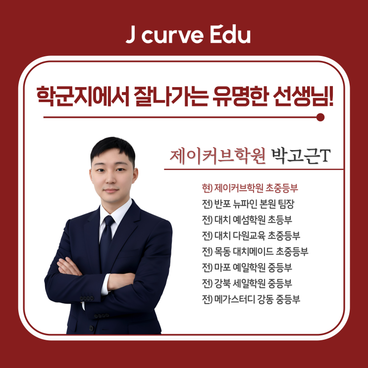 안녕하세요 서대문구 종로구 초중고 수학전문 제이커브학원입니다. 오늘은 제이커브학원 초중등 강사님으로 새롭게 오신 선생님을 소개해드리고자 합니다. '수학 실력은 억지로 끌어올린다고 자라지 않습니다. '가고 싶은 마음'이 생겼을 때, 비로소 아이의 실력도 함께 움직이기 시작합니다.' 라는 교육관으로 앞으로 제이커브학원 초·중등 학생들과 만나게 될 박고근 선생님입니다. 아이를 '과정'에 맞추지 않습니다 박고근 선생님의 수업은 미리 짜여진 커리큘럼에 아이를 끼워 맞추는 방식이 아닙니다. 학습 이력, 문제를 대하는 태도, 과제 완성도와 성실성, 단원 테스트와 총괄 평가 결과를 빠르고 정확하게....... <img src="https://blogthumb.pstatic.net/MjAyNjAyMTBfOTYg/MDAxNzcwNjkwODMwNDIz.2q2BQhV4ThzWdcz3zf1Dwg5ofsLyo9K_CTCm4Hygi68g.u_LvmVqYyD7tcpxdEW_yyPgfuhWjx38Vtw7V1grrI54g.PNG/image.png?type=s3" />