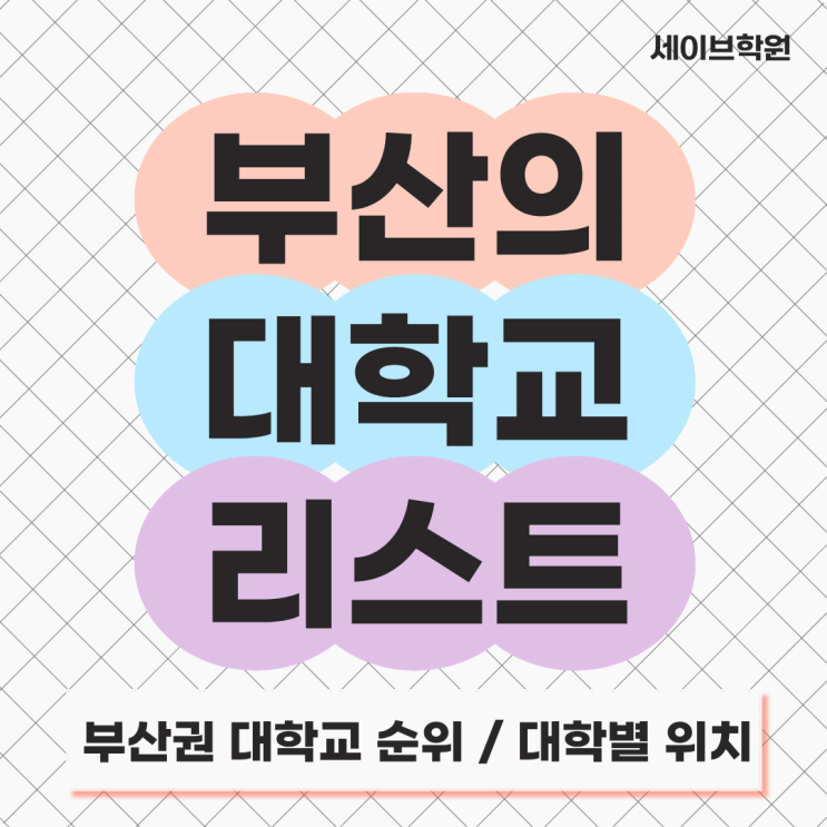 안녕하세요, 세이브학원입니다. 어느새 달력이 한 장 더 넘어가 2월에 접어들었습니다. 아침저녁으로는 아직 늦추위가 휘몰아치고 있으니, 우리 수험생 여러분들은 늘 건강에 유의하시며 체력이 입시의 밑바탕이 된다는 사실을 잊지 마시길 바랍니다. 오늘은 여러분과 함께 부산 지역에 위치한 대학교 리스트와, 입결과 취업률 등을 종합적으로 고려하여 부산 내 대학 순위를 매겨 보고자 하는데요, 대학 순위는 그 기준인 지표에 따라, 관점에 따라 다를 수 있고, 매년 미세하게 변동되기도 하니 이 포스트를 참고용으로 사용해주시면 좋을 것 같습니다. 부산은 서울·수도권 못지않게 산업과 인프라가 발달한 도시인 만큼, 국립대부터 사립대까....... <img src="https://blogthumb.pstatic.net/MjAyNjAxMjdfNjkg/MDAxNzY5NTE2NDMwMTUy.ahB02vZGSEt_ZYNOR8hDeupjkve7VI-zb76VnZKvErMg.jVsL2WUV3EqqbD5vzbkU2mvX9KM5aq92EBE1rzpH6kQg.PNG/%C1%A6%B8%F1%C0%BB_%C0%D4%B7%C2%C7%D8%C1%D6%BC%BC%BF%E4._%289%29.png?type=s3" />