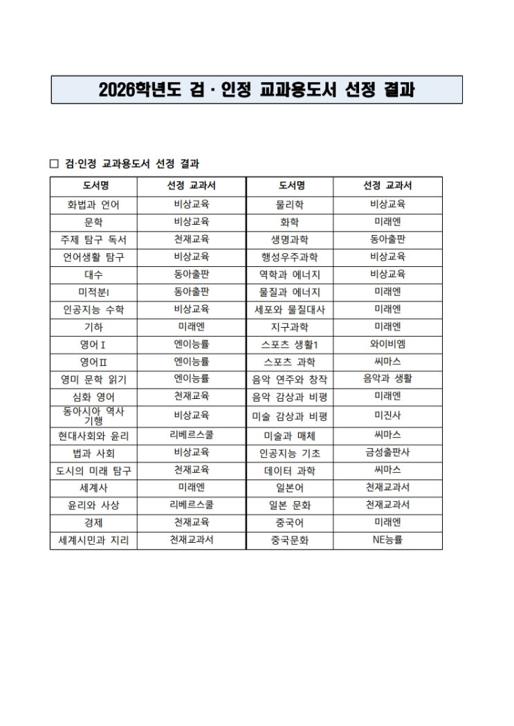 서울여고 교과서 목록