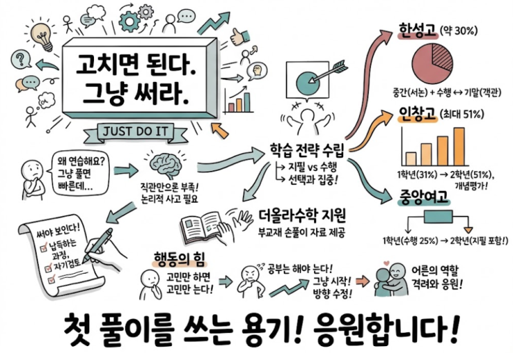 [Just Do It] 안녕하세요. 마포 더올라수학 진혜원T 입니다. 오늘은 서술형 문제에 대해 말해보겠습니다. "선생님, 서술형 문제 풀이과정을 왜 연습하라고 해요? 그냥 풀면 훨씬 빨리 풀린단 말이에요." 직관이라고 합니다. 복잡한 문제를 단순화하여 해결하는 능력. 수학의 개념을 익히고 문제를 풀어 일반화하는 과정으로 직관력을 기를 수 있습니다. 몇몇 학생들은 특정 수준을 넘는 직관력으로 눈으로도 문제를 풀기도 합니다. 하지만 이는 저를 포함한 대부분의 사람들에게 결코 쉽지 않은 능력입니다. 그러니 우리는 문제풀이를 써내려가며 나의 논리에 문제가 없는지 직접 확인해야 합니다. 서술형 문제풀이를 연습하다보면 본....... <img src="https://blogthumb.pstatic.net/MjAyNjAxMzFfMjIx/MDAxNzY5ODU2MTA1Mjcw.FPMHIDQjiCwMDMVTNercRW8YnDLmwA017ceyX_odJoog.clQKyY_wTmhZyLyOQLVZ_PJSQ2oiDwnvZotgK4l3nL8g.PNG/%C1%A6%B9%CC%B3%AA%C0%CC_%BF%E4%BE%E0.png?type=s3" />