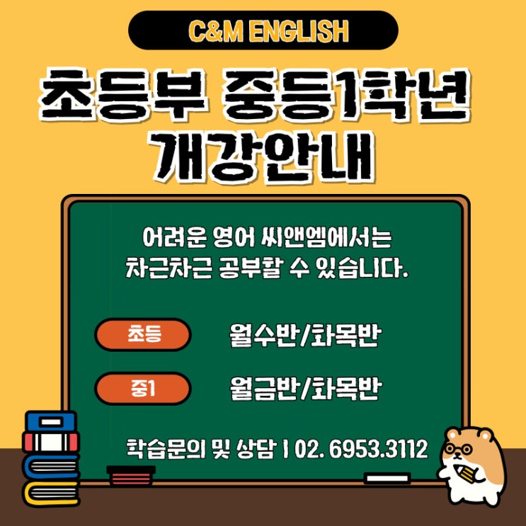 안녕하세요. C&M 영어전문학원입니다. 2026년 새학기를 맞이해서 영어학습 수준을 단계별로 올리고자 하는 초등부, 중등1 학생들을 모집합니다. C&M 영어전문학원은 대입을 성공적으로 치뤄내는 고등부와 좋은 고교를 가기 위한 노력을 하고, 고등영어를 위한 학습을 단계별로 진행하는 중등부, 그리고 학습의 습관을 잡고, 활용영어에서 시험영어로 자연스럽게 넘어가는 초등부로 구성되어 있습니다. C&M 초등부/예비중1 3월 개강일 초등 월수반: 3.4(수) 중등1 월금: 3.6(금) 초등/중등1 화목반: 3.3(화) C&M 에 대해 초등부, 중등1 학부모님과 학생들의 궁금해 하는 점. 씨앰염 영어전문학원 02-6953-3112 C&M영어전문학....... <img src="https://blogthumb.pstatic.net/MjAyNjAyMDNfMTIx/MDAxNzcwMTA1MDQ3OTcw.pWshvXY15CYWN5jkkMQ0DebKhjWd7ZVHhloO-LgOPy8g.RO_ACWfBAg74Rb5wDaCQv0TvnxNW_HryAuGRE53J41Eg.JPEG/001.jpg?type=s3" />