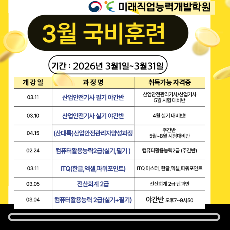 #내일배움카드 #고용24 #안전관리 #ERP생산 #경영정보시각화능력 #전산회계 #한글 엑셀 파워포인트#컴활#ITQ <img src="https://blogthumb.pstatic.net/MjAyNjAyMTFfMTYx/MDAxNzcwNzcwMTUyNzky.2fZB2ahOx0ZFCOi0lIe6gbN_-PABN5YpFdHqqr8oOyIg.VAdsZStGqGULTKGWDysTkxQCjIJ6aiCvOWesQbM3R1kg.PNG/900%A3%DF%C1%A6%B8%F1%C0%BB_%C0%D4%B7%C2%C7%D8%C1%D6%BC%BC%BF%E4_%A3%A821%A3%A9.png?type=s3" />
