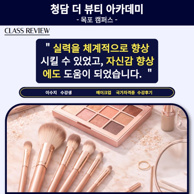 . . . 안녕하세요 목포 청담 더 뷰티 미용학원 입니다:) 목포 청담 더 뷰티 미용학원에서는 실제 수강생들의 진짜 이야기를 담은 솔직한 후기를 있는 그대로 전해드리고 있어요 여러분의 소중한 선택에 조금이나마 도움이 되길 바랍니다. . . . 오늘 포스팅 될 목포미용학원의 소중한 후기! 내용의 주인공은 바로 메이크업반의 이수지 수강생인데요~! 소중한 후기 남겨주셔서 정말 감사드려요~ 이 포스팅을 보시고 수강을 고민하시는 분들께 조금이나마 도움이 되었으면 좋겠어요. 바로 보러가실까요? . . . 요즘 미용 현장은 메이크업과 헤어를 함께 병행하는 것이 기본이죠! 그만큼 하나의 분야만 전공하는 것보다, 다양한 분야를 함께 준비하....... <img src="https://blogthumb.pstatic.net/MjAyNjAyMTFfODIg/MDAxNzcwNzg5NjQyNDEy.iekQrVBzJjJP-8xLZ7qT4_Laill4LJWBHMugilxWWmEg.YY41AV4y9rcAYL-kIh69a7VNN6LSMISW0wuyztL2nYsg.JPEG/%BA%B9%BB%E7%BA%BB_%BA%B9%BB%E7%BA%BB_%28%C0%CE%BD%BA%C5%B8%29%BC%F6%B0%AD%BB%FD_%C8%C4%B1%E2_%BE%E7%BD%C4_%BC%F6%C1%A4%BA%BB_1.jpg?type=s3" />