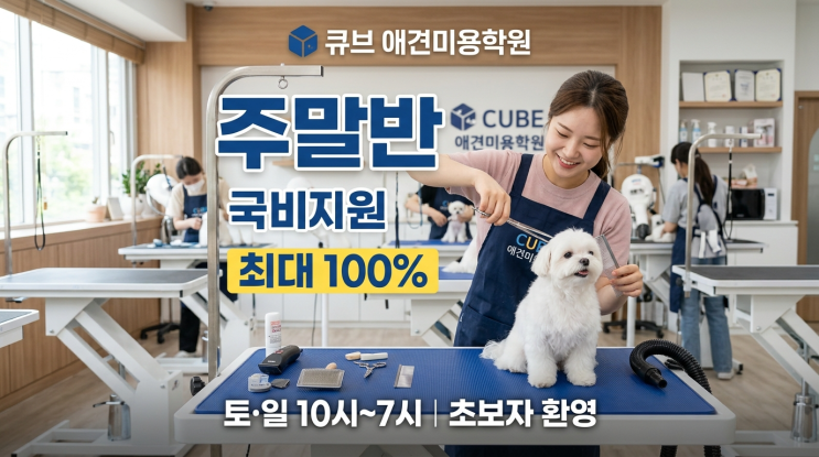 직장인·주부·학생 모두 환영! 국비지원 주말반으로 새로운 시작하세요! ✨ 평일엔 직장, 주말엔 미래 준비! 바쁜 일상 속에서도 주말만 활용해서 전문 애견미용사로 거듭날 수 있습니다! 큐브 애견미용학원 주말반은 처음 시작하시는 분들을 위한 맞춤 과정으로, 경험이 전혀 없어도 걱정 마세요. 기초부터 실전까지 완벽하게 교육해드립니다! 이런 분들께 강력 추천합니다! ✅ 직장인 - 평일 근무 후 주말에 새로운 기술 배우고 싶으신 분 ✅ 주부 - 육아·가사 병행하면서 재취업 준비하시는 분 ✅ 대학생/청년 - 취업 전 실용적인 자격증·기술 갖추고 싶으신 분 ✅ 경력단절자 - 새로운 분야로 커리어 전환 원하시는 분 ✅ 예비 창업....... <img src="https://blogthumb.pstatic.net/MjAyNjAzMTdfMjE1/MDAxNzczNzE1MzcwOTcx.qDXB7lEEqhNDqHqR8_M1szJtLaQ8YObh_Hfsd3LHBXEg.SjdEOvb8QVjqUiS1cC6oLqTnb5M7Qnr9nQp8QM7mFdQg.PNG/Professional_Korean_dog_grooming_academy_promotion-1773714827076.png?type=s3" />