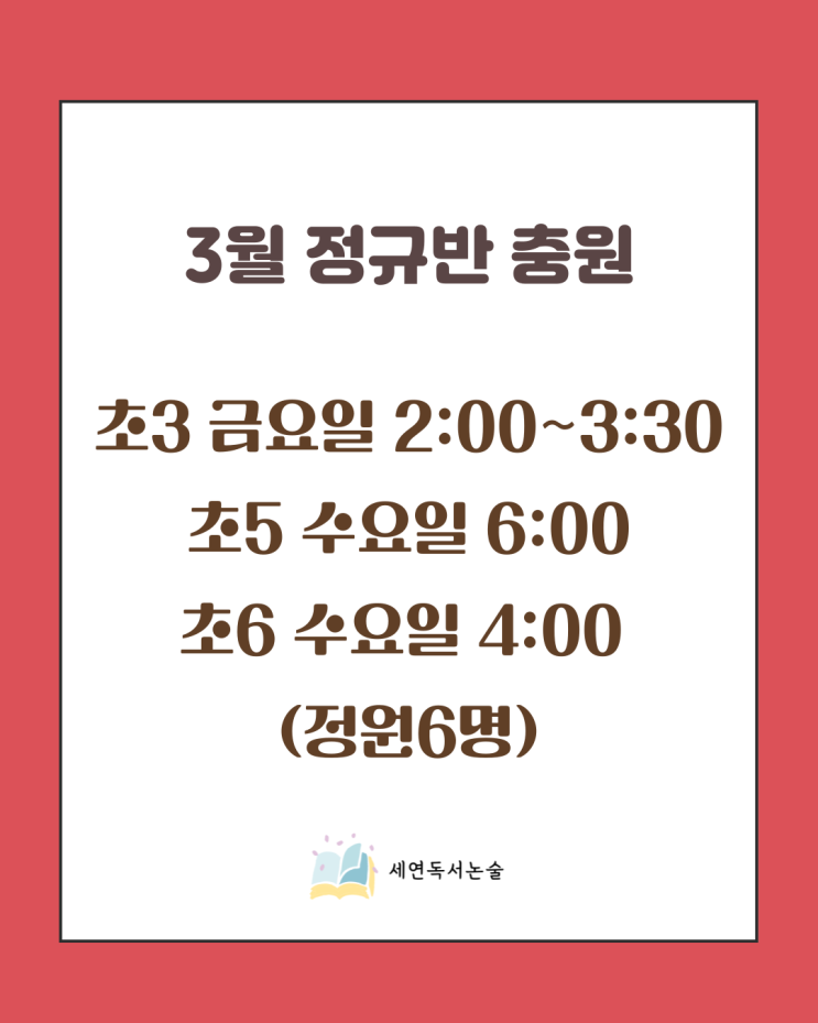 새 학기를 앞두고 스케줄 변동이 많은 시기입니다. 세연독서논술 학생들은 1월부터 새 학년으로 승급되어 방학 동안 작년보다 높은 수준의 책 읽기에 적응하고 있습니다. 글밥이 늘어난 새 책을 받고 걱정하던 아이들도 수업 후 금세 자신감을 되찾고 다음 책을 궁금해하네요. ✔️논술을 처음 접하는 학생들 ✔️또래 친구들과 책 이야기를 나누고 싶은 학생 ✔️글쓰기를 통해 마음을 열고 표현하는 법을 배우고 싶은 학생 ✔️한국사를 깊이 있게 이해하고 싶은 학생 ✔️새해에는 더 성장하고 싶은 마음을 가진 학생 환영합니다. ☎️010-6386-4240 이외에 기존 정규반에도 자리가 날 경우 대기중이신 분께 순차적으로 연락 드려요. 다음주 교....... <img src="https://blogthumb.pstatic.net/MjAyNjAyMTlfMTQ0/MDAxNzcxNDc3OTM2Njc5.hHuIE79Nv2EbvuMuexla43dgPJ14q0YWhp56yQaxdbEg.03pAegAquaV_Vf3NKgKbEVa474uTBKcGbd2syWoNaS4g.PNG/030.png?type=s3" />