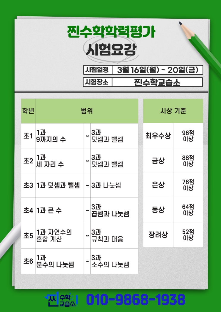 안녕하세요, 찐쌤입니다~ 찐수학학력평가 안내 우리 친구들이 방학 동안 열심히 공부한 것, 이번 기회에 실력을 확인해보는 시간을 갖으려 합니다! 시험이라고 너무 긴장하지 말고, 지금까지 배운 것들을 자신 있게 풀어보는 자리이니 가볍고 즐거운 마음으로 참여해 주세요 3월 16일(월) ~ 20일(금) 찐수학교습소 점수에 따라 치킨, 김세트, 학용품, 젤리 등 푸짐한 상품도 준비되어 있으니 기대해 주세요! 우리 친구들 모두 파이팅!! 자세한 내용은 아래 사진을 확인해 주세요 문의 : 010-9868-1938 <img src="https://blogthumb.pstatic.net/MjAyNjAzMDdfMjAw/MDAxNzcyODQ5NTg1OTU4.7tn7MKZgrwvxJIQLrckpfC3h8C1vQQBQLZ6cYVED2LQg.5TBFMuWZh0c3YmK4XL96lwtpXR5otbAZNhc4vM9lYqEg.JPEG/%BC%F6%C7%D0%C7%D0%B7%C2%C6%F2%B0%A1_%B9%FC%C0%A7_1%C8%B8%C2%F7.jpg?type=s3" />
