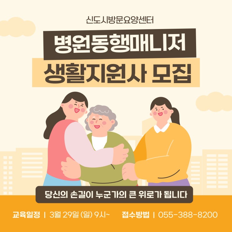 문의 및 접수안내 ☎️ 055 - 388 - 8200 ☎️ 신청서 작성 + 사진1매 제출 필수 <병원동행매니저> 정부에서 거동이 불편하거나 혼자 병원가기 어려운분들에게 '병원 안심동행서비스'를 제공하는데 이때 함께 가서 보호자를 대신해 병원 이동, 접수, 귀가까지 동행 <생활지원사> 일상생활이 어려운 취약노인에게 적절한 돌봄서비스를 제공하여 안전과 기초적인 생활을 제공하여 어르신들의 건강과 안녕을 지원 < 훈련장소 안내 > 부산광역시 북구 금곡대로 304 신도시방문요양센터 <img src="https://blogthumb.pstatic.net/MjAyNjAyMjRfMTM0/MDAxNzcxOTA0ODE5Mzk3.wWAOCxGk_YVl-j7bq3Z60Z2pG56bXQ3DxnkQQYXecTQg.xDu80gfURtZaNrIBywJlAGqG0-3D-3XWRto10KP5R1Qg.JPEG/001.jpg?type=s3" />