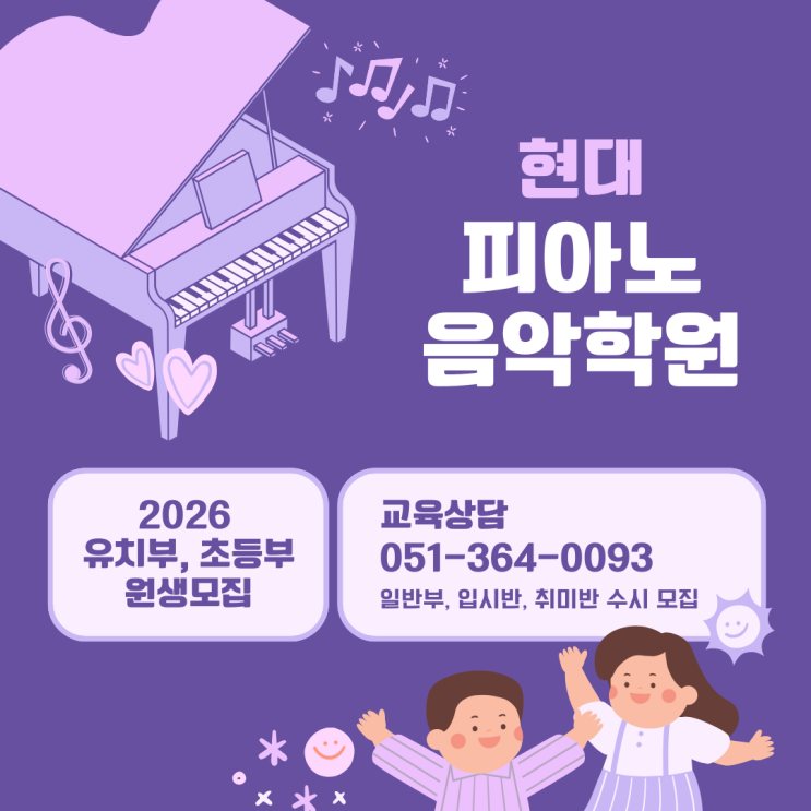 안녕하세요 아이들이 음악을 즐겁게 배우고 성장하는 공간 현대음악학원 입니다! 피아노는 단순히 악기를 연주하는 것을 넘어 아이들의 집중력,표현력,감수성,그리고 성취감을 함께 키워주는 좋은 교육입니다. 처음 피아노를 배우는 아이들은 한 음 한 음을 익히는 것부터 시작 하지만 꾸준한 연습과 올바른 지도 속에서 어느 순간 스스로 음악을 표현하며 연주하는 모습을 보여주게 됩니다. 저희 현대음악학원에서는 아이들이 음악을 통해 즐거움과 성취감을 느끼며 건강하게 성장할 수 있도록 늘 노력하고 있습니다. 처음 피아노를 시작하는 아이들도,이미 배우고 있는 아이들도 각자의 속도에 맞추어 기초부터 탄탄하게 지도해드리겠습니다. 현....... <img src="https://blogthumb.pstatic.net/MjAyNjAzMDVfMTA5/MDAxNzcyNjg0NzczNDIw.D9EpKWGB-1WD6m-tXKSnOPnl5OEA3U0W_WINQqNn2IIg.H3R6J480RmbdwfWS3T3R_ujnkriMt-gBmr3UEFTyXRwg.PNG/%BA%B8%B6%F3%BB%F6_%B1%CD%BF%A9%BF%EE_%BE%EE%B8%B0%C0%CC_%C7%C7%BE%C6%B3%EB_%C0%BD%BE%C7_%C7%D0%BF%F8_%BF%F8%BB%FD%B8%F0%C1%FD_%C0%CE%BD%BA%C5%B8%B1%D7%B7%A5_%B0%D4%BD%C3%B9%B0_%281%29.png?type=s3" />