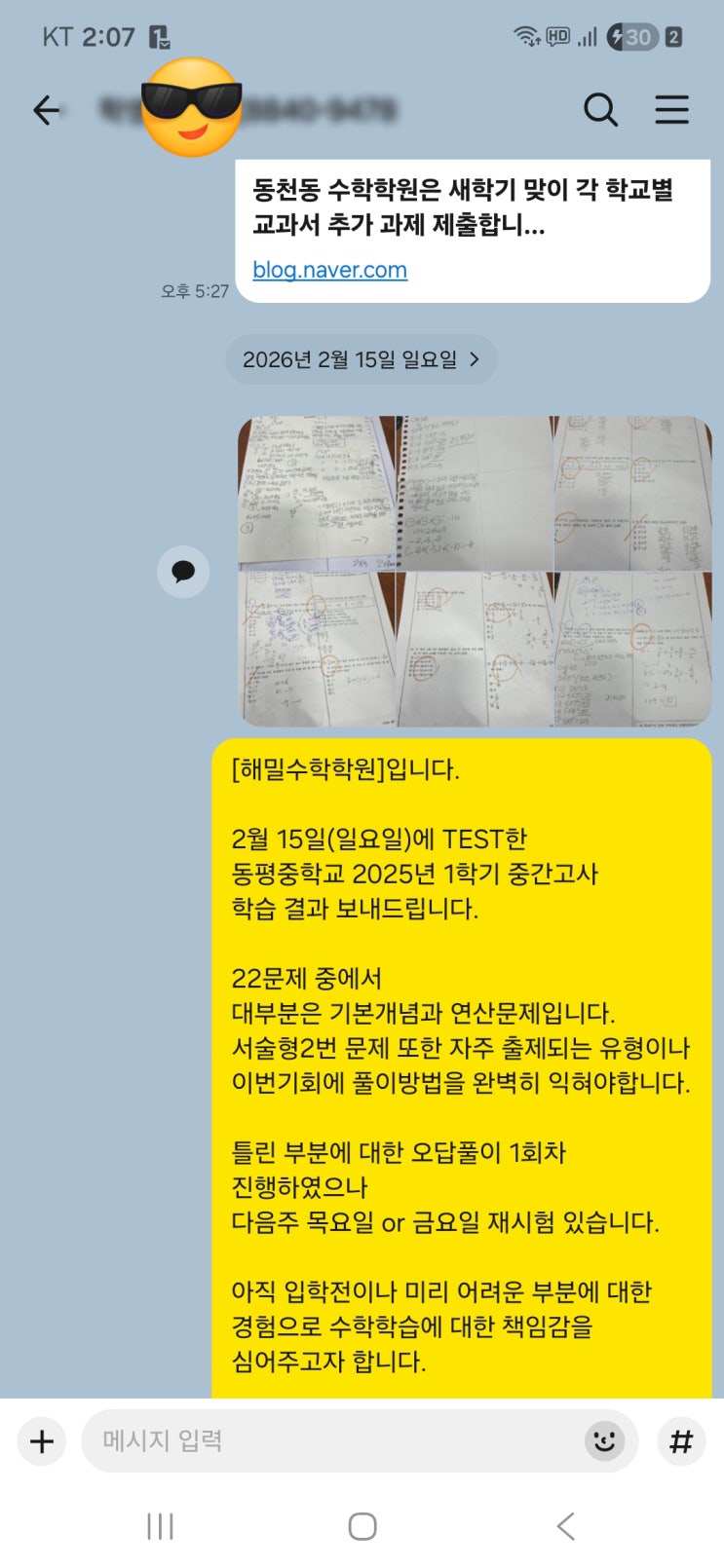 동천동 중등수학학원에서는 시험기간에만 기출문제를 소개하진 않아요 !! 즉 중간고사 범위 이상으로 정규진도가 나간 경우에는 학교별 기출문제를 미리 풀어봄으로 아~ 내가 이런 실수를~!! 아 ~ 이렇게 문제를 출제하시네 !! 아~ 교과서 문제를 열심히 풀어야겠다 !!(시험에 나오니깐^^) 1월 첫째, 둘째주에는 예비고등1학년들을 대상으로 3월 모의고사 무료특강을 1회차, 2회차 1월 셋째, 넷째주에는 예비중등3학년들을 대상으로 제곱근 집중 무료특강 1회차, 2회차 2월 첫째,둘째주에는 예비중등1학년들을 대상으로 미리보는 중간고사 TEST 및 풀이 무료특강 1회차, 2회차 그럼 다음은 어느학년에 대한 무료특강을 진행할까요?? ^^ 눈치게임....... <img src="https://blogthumb.pstatic.net/MjAyNjAyMTlfMTY1/MDAxNzcxNDg5NTI3OTIx.AoHA4NvcpiwFVq7RTbb7okmrHzs57ZvIw-lBOXQZaiAg.vcKOHA-X73uAECkIW_vzCAp5aq98PVutVuKLDZfFFnog.JPEG/KakaoTalk_20260218_140847698.jpg?type=s3" />