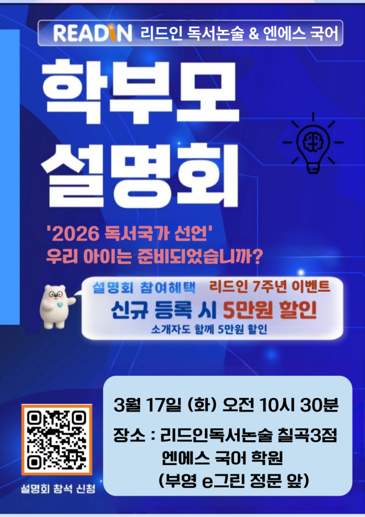 2026 독서 국가 선언 우리 아이는 준비되었습니까? 안녕하세요^^ 칠곡3점 글담쌤입니다. 신학기를 맞아 학부모설명회를 개최하게 되어 자세한 안내드립니다. 초등 독서 습관부터 중등 국어 실력까지, ‘읽기’가 ‘성적’으로 연결되는 방법 “어떻게 하면 책을 가까이 할 수 있을까요?” “독서량은 많은데 제대로 보는지 궁금해요” “책은 읽는데 왜 글쓰기는 늘지 않을까요?” “독서량은 많은데 국어 점수는 그대로예요.” “중등 올라가면 국어가 확 어려워진다는데, 지금 뭘 준비해야 할까요?” 학부모님들과 상담을 하다 보면 가장 많이 나오는 고민들입니다. 그래서 이번에는 독서를 ‘학습 효율성' 으로 연결하는 방법을 한 자리....... <img src="https://blogthumb.pstatic.net/MjAyNjAyMjJfMTgg/MDAxNzcxNzI0NzcwOTU0.Psn0_IjivHyaKiztAwjiX_aX7irmKq2-HPXcH5Ftz5kg.VVvcgfYFfcA18sGKWhuhw8QVr_tenoCxzrG0GuFFXdYg.PNG/%C1%A6%B8%F1%C0%BB-%C0%D4%B7%C2%C7%D8%C1%D6%BC%BC%BF%E4_-001.png?type=s3" />