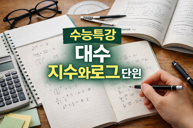 수능 준비를 하다 보면 지수와 로그 단원에서 막히는 학생들이 많다. 수능특강 대수 지수와로그 단원은 처음엔 공식이 많아 보이지만, 원리만 제대로 이해하면 오히려 문제 풀이가 수월해지는 단원이다. 이번 학습에서는 수능특강 대수 지수와로그 단원을 중심으로 문제를 하나하나 손풀이로 정리하며 개념을 다시 확인했다. 수능특강 대수 지수와로그 단원에서 가장 중요한 것은 공식 암기가 아니라, 왜 이런 성질이 나오는지 이해하는 것이다. 지수법칙이나 로그의 성질을 무작정 외워서 적용하면 문제 상황이 조금만 바뀌어도 헷갈리기 쉽다. 그래서 문제를 풀 때는 풀이 과정을 생략하지 않고, 손으로 직접 써 보면서 생각의 흐름을 정리하는....... <img src="https://blogthumb.pstatic.net/MjAyNjAyMDRfMjY1/MDAxNzcwMjA5NDAzMTc1.Zz5pQ41Wr2uz7UA9hAi73OofVZROg6If6rDqVvjOxYsg.RENtncLyal2FWjTmVDSA_DeZDQd_UW07UIV-eng1oM0g.PNG/ChatGPT_Image_2026%B3%E2_2%BF%F9_4%C0%CF_%BF%C0%C8%C4_09_49_54.png?type=s3" />