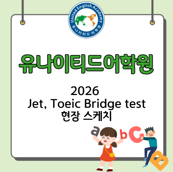 안녕하세요, 화원영어학원 유나이티드 영어학원입니다! 지난 2월 8일(일), 우리 학생들은 Jet 시험과 Toeic Bridge 시험에 도전하였습니다. JET는 영어의 기본 실력과 듣기·읽기 능력을 점검하는 시험이고, TOEIC Bridge는 실생활 영어 이해 능력을 중심으로 한 단계 높은 수준을 확인할 수 있는 시험입니다. 시험을 위해 오랜 시간 열심히 공부해 온 친구들. 평소보다 더 집중해서 문제를 풀고, 틀린 문제는 다시 확인하며 공부하였습니다! 그리고 드디어 시험 당일. 이른 아침부터 학원에는 아이들이 하나둘씩 모여들었습니다. 아직 잠이 덜 깬 얼굴이었지만, 그 안에는 긴장과 설렘이 함께 담겨 있었습니다. 연필과 수험표 등 준비물을 다시 한....... <img src="https://blogthumb.pstatic.net/MjAyNjAyMDlfNzYg/MDAxNzcwNjMzMTAyNTM2.qgV92uXV0dADIqbaTxx3wpzsFz_O7Oq15cT6qjJ-oMsg.TBbFdZ9R6lXAUy2kicOCGBG4ZOvENuCNsdDbLc7SJkUg.PNG/image.png?type=s3" />