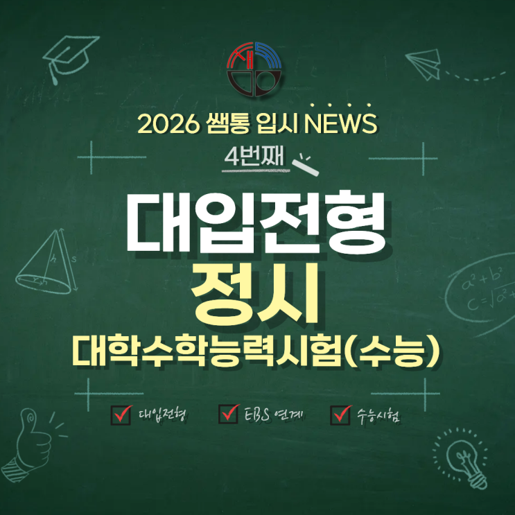 안녕하세요. 인천 용현동에 위치한 수학 과학 전문학원 ' 쌤과 통하는 학원 ' 입니다. 대입전형 소개는 앞서 안내드린 것처럼 시리즈로 연재되고 있습니다. 아직 읽어보지 못한 분들은 이전 포스팅을 참고해주세요! 학생부 교과전형, 학생부 종합전형에 이어 오늘 안내드릴 2026년 네 번째 입시뉴스! 대학입학 전형 중에서도 오직 한 번의 시험, 수능 성적을 중심으로 선발하는 ‘정시’ 에 대해 소개합니다! 정시전형은 고등학교 내신, 학교생활기록부, 비교과활동 등등 고등학교 성적과 스펙을 거의 보지 않고, 대학수학능력시험(수능) 성적을 중심으로 학생을 선발하는 전형입니다. 한 마디로 정시전형은, “학교 성적과 관계없이 수....... <img src="https://blogthumb.pstatic.net/MjAyNjAyMDJfNiAg/MDAxNzcwMDM0ODc1NDcw.4UIaLyFFteS5g7wjrNO0_60Es3SgtGBUKxDOZzKXwTUg.xWYfj8uXmQVX07VO_Tjnzj_D7AEm91fHr_uPCX21FKIg.PNG/%C1%A6%B8%F1%C0%BB_%C0%D4%B7%C2%C7%D8%C1%D6%BC%BC%BF%E4._%2810%29.png?type=s3" />