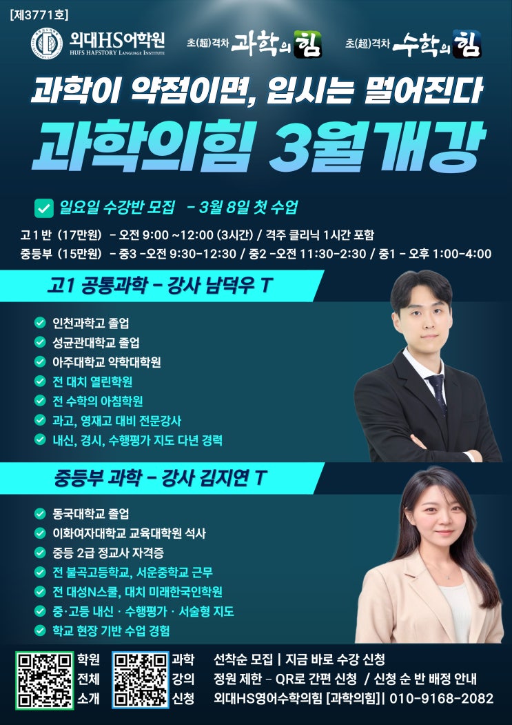 과학, 아직도 “암기 과목”이라고 생각하시나요? 중등, 고등으로 올라갈수록 과학은 단순 암기가 아니라 이해력 + 사고력 + 누적 구조 과목으로 바뀝니다. 특히 중2 이후부터 학부모님들 상담에서 가장 많이 나오는 이야기: “갑자기 과학이 너무 어려워졌어요…” “외워도 점수가 안 나와요…” “놓친 단원이 너무 많아요…” 이유는 간단합니다. 과학은 ✔ 한번 흐름을 놓치면 ✔ 뒤에서 따라잡기가 거의 불가능에 가깝고 ✔ 학년이 올라갈수록 난이도는 기하급수적으로 상승하기 때문입니다. 그래서 과학은 내신 대비만 하는 과목이 아니라 선행이 반드시 수반되어야 안정적인 과목입니다. ✅ 왜 우리 학원 과학 수업인가? 이번 일요일 과....... <img src="https://blogthumb.pstatic.net/MjAyNjAyMTJfMjYg/MDAxNzcwODg2MTg2Mzk0.3tdjSxuTVw4EHAcRC5ZxQ7OWY3avhx1Ajm9rcuNdOywg.OanTwuQJIiv0_rTZ6OXAfsLbx0sqw3dKyRwDlrGzVx8g.JPEG/%C1%A6%B8%F1%C0%BB-%C0%D4%B7%C2%C7%D8%C1%D6%BC%BC%BF%E4_-001_-_2026-02-06T190446.319.jpg?type=s3" />