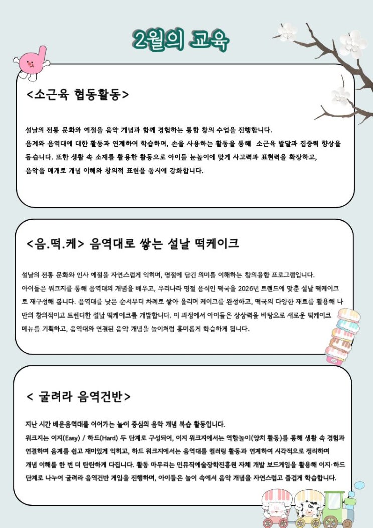 안녕하세요! 26년 2월 특강 안내드립니다~! 2월은 설날의 전통 문화와 예절을 음악 개념과 함께 경험하는 통합 창의 수업을 진행합니다. 음계와 음역대에 대한 활동과 연계하여 학습하고, 손을 사용하는 활동을 통해 소근육 발달과 집중력 향상을 돕습니다. 또한 생활 속 소재를 활용한 활동으로 아이들 눈높이에 맞게 사고력과 표현력을 확장하고, 음악을 매개로 개념 이해와 창의적 표현을 동시에 강화합니다. <img src="https://blogthumb.pstatic.net/MjAyNjAyMDRfNDgg/MDAxNzcwMTczNzk1MTM2.itOEr98DhVqy5SeC7m67X_Pt37ejOgrEQft70M8oAG8g.bKy3Q--xPBB8EedcSlw_fIMw4qf_MnUtUtVmVOxxA9Ag.JPEG/KakaoTalk_20260204_115616852.jpg?type=s3" />