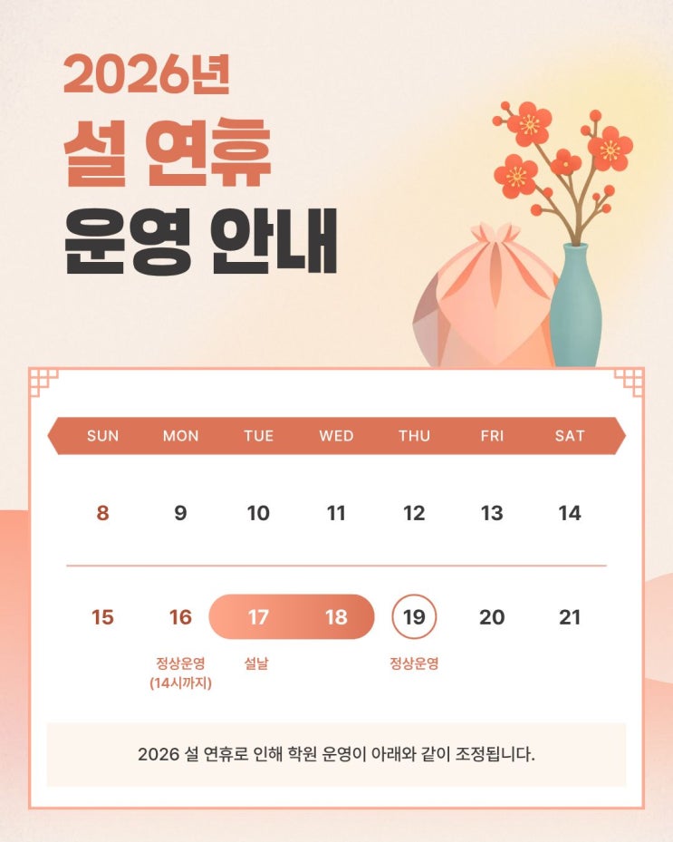 안녕하세요! 꿈을굽는 제과제빵학원입니다. 2026년 설 연휴 학원 운영 일정을 안내해드려요 :) 2월 16일 14시까지 정상운영 2월 17일 / 2월 18일 휴무 2월 19일 정상운영 새해 복 많이 받으시고, 따뜻하고 풍성한 설 연휴 보내세요♀️ <img src="https://blogthumb.pstatic.net/MjAyNjAyMTJfMTEg/MDAxNzcwODg5NzI1Mzc3.krcvmibmUHYi5UJcfW2MsuNTh3t3iMKcswRarcgPpu4g.88T49Lw_O-35A4-5k4tVYTGjm90Opyi0a6Pxz-RVjqMg.JPEG/%C1%A6%B8%F1%C0%BB_%C0%D4%B7%C2%C7%D8%C1%D6%BC%BC%BF%E4._%284%29.jpg?type=s3" />
