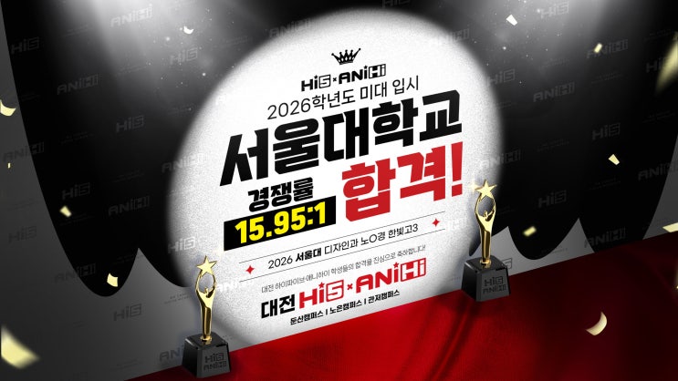 안녕하세요. 대전 하이파이브·애니 하이 미술 학원입니다! 앞서 전국 대학 합격 소식을 1탄으로 나눠서 전해드렸는데요. 이어서 오늘은 그중에서도 많은 학생과 학부모님들께서 관심을 갖고 계신 서울·경기권 대학 합격 결과를 준비해왔습니다. 특히 일부 대학은 최대 30.83:1까지 경쟁률이 치솟는 등, 서울·경기권 대학 대부분이 높은 경쟁률을 기록했는데요! 이러한 치열한 전형 속에서도 대전 하이파이브·애니 하이 학생들은 서울·경기권 17개 대학에서 총 36명의 합격생을 배출하며 의미 있는 결과를 만들어낸 기쁜 합격 소식! 지금 바로 전해드리겠습니다. 서울대학교 경쟁률 15.95:1 합격! 홍익대학교 최대 경쟁률 7.54:1 6명 합격! 경기대....... <img src="https://blogthumb.pstatic.net/MjAyNjAyMTJfMTYg/MDAxNzcwODkyODQ5OTUx.0FMUz88XUS8LIvhpc0usk_sw7oXdZgKAhrOVTzE1ChAg.F8mGhk3rcbHXdXXDrwZSR1mYbKfzhGqp5g_dW8ANIRQg.JPEG/KakaoTalk_20260212_192433032_04.jpg?type=s3" />