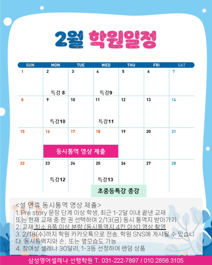 [삼성영어셀레나 선행학원]2월 학원 소식/선행초영어/세곡초영어/권선동 초중등영어