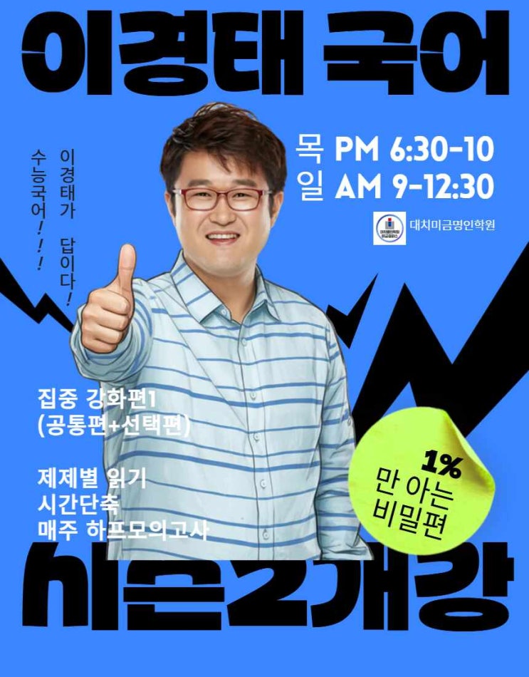 ♥ 고3 수능국어 이경태T 시즌2 ♥ ★ 2025 수능까지 4년 연속 만점자 배출! ★ 2026 수능 최고점 한개 틀린 학생, 90점이상, 1등급 다수 배출! ★ 20~25년 서울대 52명, 의대/연대/고려대 150명 배출! ★ EBS 연계 포인트 완벽 대비로 학생들의 폭발적 후기! ★ 4등급 -> 1등급 성적업 노하우 이경태T만 가능!! 성적업 의심하지 마십시오!! 이경태쌤이 당신의 멘토가 되어 드리겠습니다!! ▣ 수업 일시 - 목 PM 6:30-10시(3/12 개강) - 일 AM 9-12:30(3/15 개강) ▣ 수업 내용 - 독서 : 제제별 읽기 - 문학 : 시간 단축 - 매주 하프 모의고사 실시 ▣ 시즌2 커리큘럼 [ 1%만 아는 비밀편 ] ★ 집중 강화편1 (공통편 + 선택편) 1. 고난도 글(독....... <img src="https://phinf.pstatic.net/image.nmv/blog_2026_02_22_3817/pwDVAtMoqY_03.jpg?type=f480x480" />