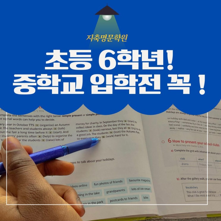 지축명문학원 초등 6학년 영어, 이번 겨울방학에 반드시 해야 할 공부는 따로 있습니다 벌써 12월도 중순으로 가고 있죠. 조금만 지나면 초등 6학년 학생들은 중학교 1학년이 됩니다. 처음으로 교과서가 바뀌고, 처음으로 내신이라는 단어를 접하게 되죠. 그중에서도 영어 과목은 시작부터 큰 격차가 벌어지기 쉬운 과목입니다. 겨울방학을 앞두고 많은 학부모님들께서 물어보십니다. “겨울방학 동안 뭘 제일 먼저 준비해야 할까요?” 영어는 해야 할 게 많지만 그중에서도 “단어, 품사 구별”이 필수입니다. 지금 영어 문장을 문장처럼 읽고 해석하는 친구들과 단어 하나하나를 따로 떼어 읽고 해석하는 친구들은 중학교 입학 후 영어 성적에....... <img src="https://blogthumb.pstatic.net/MjAyNTEyMDhfMjA4/MDAxNzY1MTU5NjIyNTI5.gDz7ellB7srRWrwLG00Q1RTutPrRQvlLbMFFp4nsqxUg._mNxtnuoi3KaXjUhOS8F-9FpX-rGqn8m9xN381vyxOQg.JPEG/%C1%F6%C3%E0%C3%CA.jpg?type=s3" />