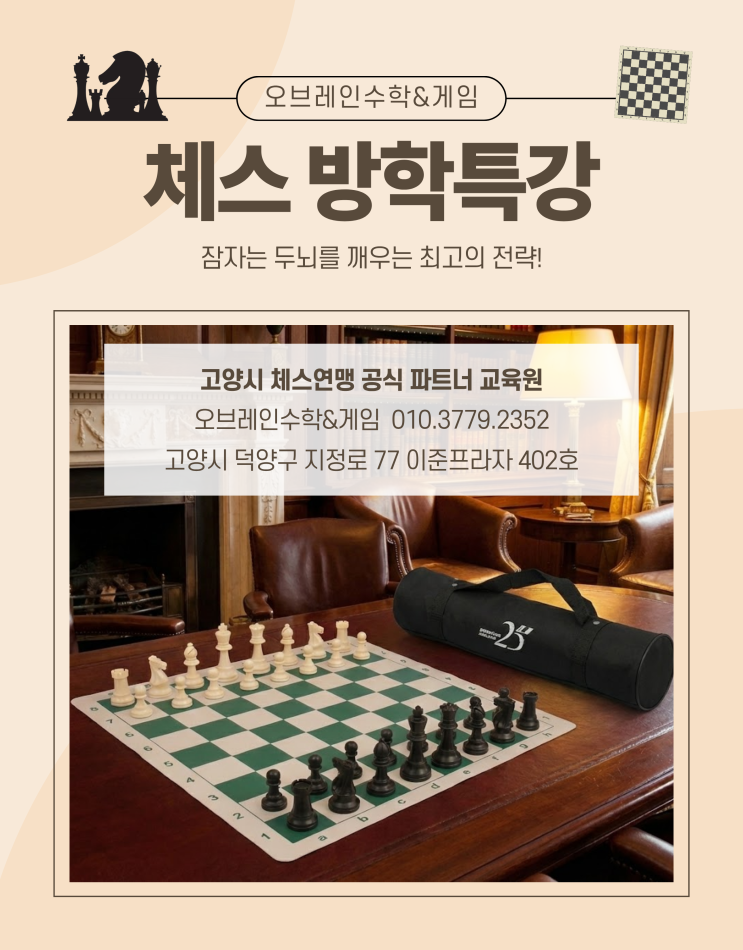 신청 및 문의 : 010-3779-2352 문자로 신청 (거주지역/자녀이름/자녀연령/신청과목(체스)/학부모님성함 작성) 교구로 배우는 사고력프로그램 전문 오브레인수학&게임 #오브레인체스 #겨울방학체스 #초등체스수업 #유아체스수업 #사고력체스 #두뇌트레이닝 #집중력향상 #논리적사고 #체스학원추천 #방학특강 #생각하는아이 #고양시체스 #덕양구체스 #지축체스 #삼송체스 #신원동체스 #원흥체스 #도래울체스 <img src="https://blogthumb.pstatic.net/MjAyNTEyMTVfMjAg/MDAxNzY1ODAzODkyODIx.aZOYEp160aRdkVBfc9aeFmy173vFF8PcL01B4V5zNL0g.4Q--yFBWKFUdzBY1gFtuEaTKgiDmnf-GSs_k4DK3N40g.PNG/1.png?type=s3" />