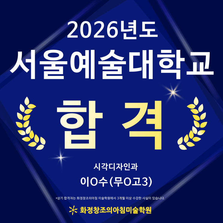 서울예대 합격한 이0수 학생 합격을 진심으로 축하합니다! 화정 창조의아침 미술학원 - 디자인 전문반 디자인 입시, 실력으로 증명합니다! 창조의아침 미술학원 디자인입시전문반 학생들의 작품 퀄리티가 한층 더 높아졌습니다. 세밀한 개체 묘사, 감각적인 공간 구성, 그리고 창의적인 표현력까지! 꾸준한 연습과 노력으로 완성된 학생들의 결과물이 입시 경쟁력을 증명합니다. 더 정교해진 표현력 – 정확한 형태와 깊이 있는 명암 완성도 높은 공간 구성 – 창의적인 시각과 안정적인 구도 실전 감각을 살린 연습 – 대학교 실기대회 및 입시 대비 김유진 강사님의 지도 아래, 학생들은 꾸준한 성장과 발전을 이어가고 있습니....... <img src="https://blogthumb.pstatic.net/MjAyNTEyMThfMTU3/MDAxNzY2MDM1NjI5OTYw.sUZCtn6p45yFWkHxsS73WfzlChnNZK8fo5lx1r2fymEg.Fdu0CdVIN59ZecfEaY7iy0xiyyekD1iXOX3k8tj42Dgg.PNG/2026%BC%AD%BF%EF%BF%B9%B4%EB_%C0%CC%C7%F6%BC%F6.png?type=s3" />