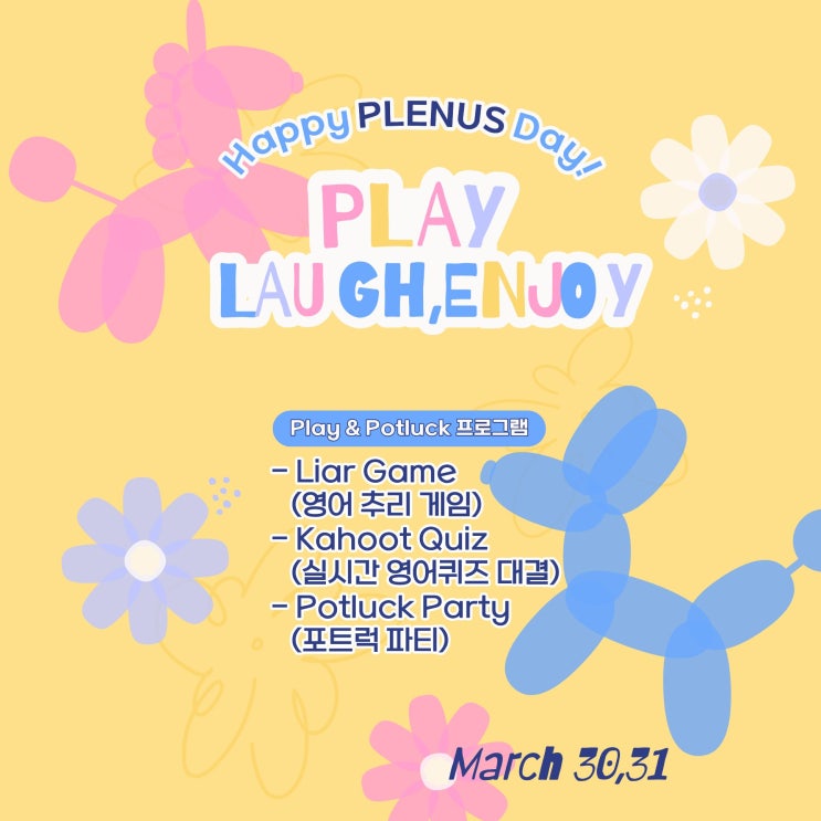 [3월30일~31일] 새 학년과 새 레벨에 적응하느라 고군분투한 학생들을 응원하기 위해 ‘Play & Potluck Day’를 준비했습니다. 학생들이 학업의 부담을 덜어내고 즐거운 마음으로 3월을 마무리할 수 있도록 알차게 준비하겠습니다. <img src="https://blogthumb.pstatic.net/MjAyNjAzMjNfMjcg/MDAxNzc0MjY4MTA0OTEx.rI0RWRkWIzirAoOyz8oSidWBVrcl8vB8NrzQTf8ekzIg.2V6jfV1Z00qphW4s1bAAb9HeFn1a-aOb1NGe85rxuDgg.JPEG/%C1%A6%B8%F1%C0%BB_%C0%D4%B7%C2%C7%D8%C1%D6%BC%BC%BF%E4._%2816%29.jpg?type=s3" />
