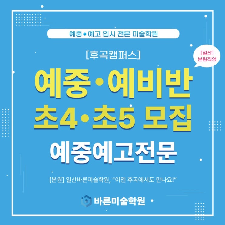 안녕하세요 일산바른미술학원 후곡점 입니다. 어느 덧 3월 마지막이 다가오고 있습니다. 새학기 시작한지 벌써!! 한달이 지나가 어느새 4월의 봄이 다가오고 있습니다~ 따듯한 봄날의 햇살을 맞이하여 준비 했습니다. 저희 일산바른미술학원을 통해 2027년도 예중예비반 모집 상담문의 주시기 바랍니다. ★입시상담 및 예약문의★ 031-918-0403 그럼 같이! 예중예비반 모집에 대해서 살펴 보도록 할까요? 예중예고입시전문학원 예중&예비반 모집 안내 저희 일산바른미술학원 에서! 2027년 예중 예비반 모집 진행 중 입니다!! ★모집대상★ 예비초등학교 4학년, 예비초등학교 5학년 합니다. ★결과 입증★ 2026년도 예중입시합격결과! ★예원....... <img src="https://blogthumb.pstatic.net/MjAyNjAzMjRfMTUw/MDAxNzc0MzI5MjA4MzIx.IxP5COjNLK8UHb2jWLxFcEynqspaHfsEf5jdw1oYrPwg.fAl3Ah9dG9mJSDNCXdNyjz94zCjQ6pW7gL99ZJCPR1Ig.JPEG/240113_%B9%D9%B8%A5%B9%CC%BC%FA%C7%D0%BF%F8-%BF%B9%C1%DF-%BF%B9%BA%F1%B8%F0%C1%FD%B9%E8%B3%CA.jpg?type=s3" />