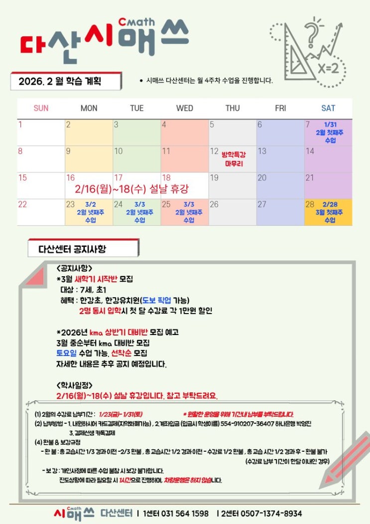 안녕하세요 시매쓰 다산센터 원장입니다. 이제 긴 겨울의 끝자락입니다. 아이들의 겨울방학도 끝이 보이고 있습니다. 겨울 방학기간 늦잠 자고 싶을 텐데 아침 일찍 일어나 부지런히 학원에 와서 시매쓰 방학 특강을 한 아이들 칭찬합니다. "오늘은 정말 일어나기 싫었지만 꾹 참고 왔어요" 하는 아이들을 볼 때마다 정말 대견합니다. 분명히 실력적으로 상승하고, 자기와의 싸움에서 승리한 아이들의 자존감은 높아졌을 거라 생각합니다. 2월 설 연휴로 긴 휴무 기간 동안 아이들의 몸과 마음이 성장하고, 건강한 모습으로 다시 새 학기를 준비하도록 합니다. 시매쓰 학부모님 아이들 그리고 시매쓰 선생님 운영진들 모두 새해 복 많....... <img src="https://blogthumb.pstatic.net/MjAyNjAyMDlfMjAw/MDAxNzcwNjE5ODI1NDM4.Qt7sCXUb3hOFbAzX_GXH_i8Ne9fHBF_CGIcS6NfAqoYg.hZbSkZ7wZ47_6reS26niy9rT7pmUCbo-6M7eCmenYI0g.JPEG/KakaoTalk_20260209_154943838.jpg?type=s3" />
